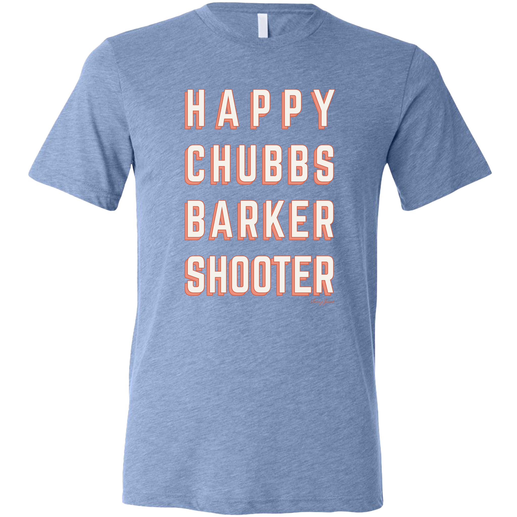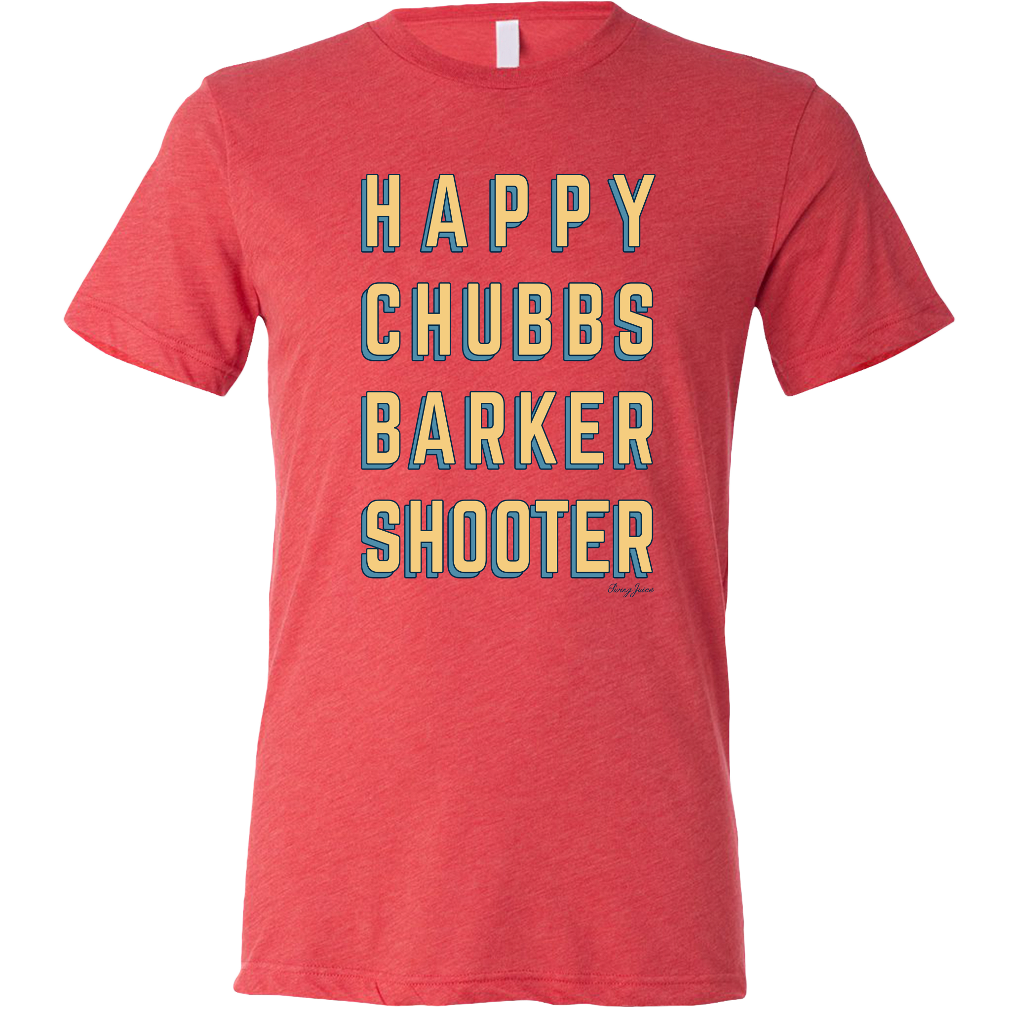 SwingJuice Short Sleeve Unisex T Shirt Golf Happy Chubbs Barker Shooter. High quality 50% polyester, 25% combed ringspun cotton, 25% rayon. 100% soft and comfortable. Virtually no shrink.