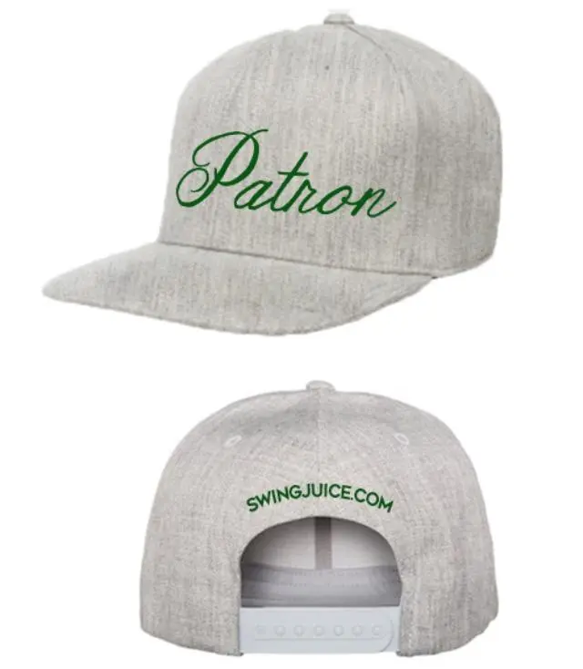 Flex Fit snap back adjustable closure. Heather Grey hat with the wording Patron on the front in an Evergreen color logo. Raised and embroidered swingjuice.com on back. Adjustable + Flexfit technology. Classic shape, matching plastic snap amp; undervisor. Hard buckram, Moisture absorbent elastic sweatband. Premium Wool blend. And So incredibly Trendy. One Size Adjustable.